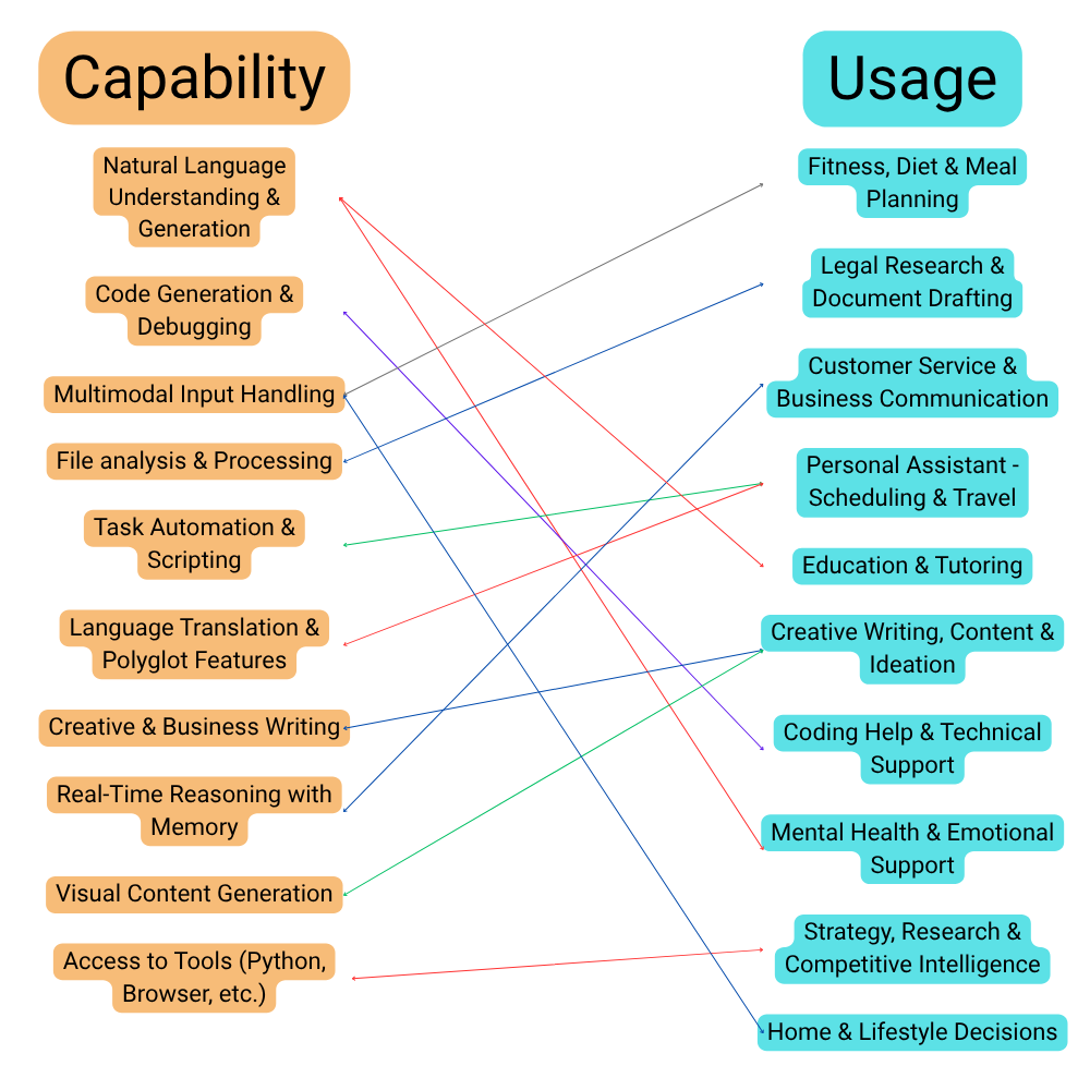It is not very dramatic but I still think it is quite telling. We have ten capabilities of ChatGPT on the left, as ranked by itself and ten ways ChatGPT says people actually use it on the right. The lines show connections to the relevant use cases. It is a kind of blueprint of how AI is used in practice. As can be seen there seems to be a distinct gap between what is possible and what the real world uses it for.